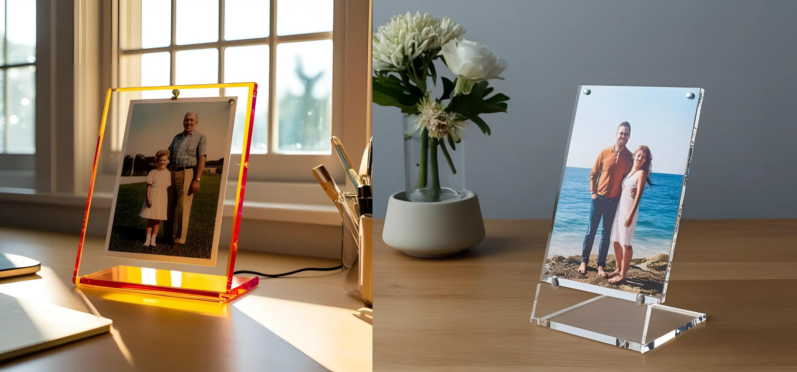 Brighten up your workspace with our Acrylic Desk Photo Stands. These free-standing displays are perfect for desks, shelves, or tabletops, featuring crystal-clear acrylic that makes your photos pop with vibrant clarity.